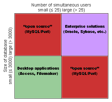 This simple matrix illustrates one approach to selecting the appropriate database application for your need. Along one axis is the size of your database. Along the other axis is the number of simultaneous users you expect to use your database.